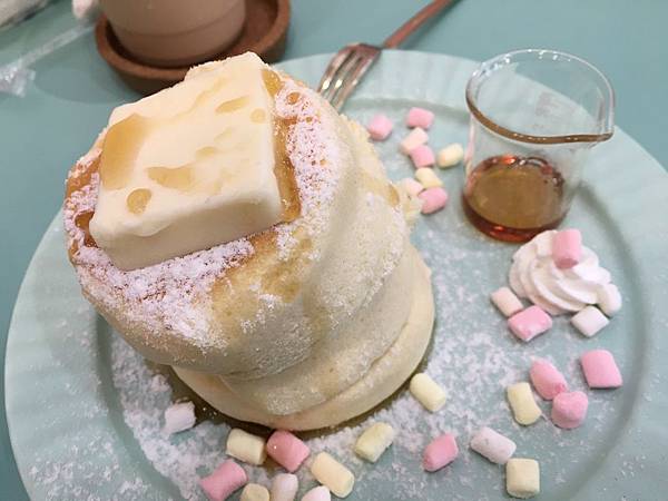 煎台上煎著鬆餅,白白圓圓的看起來好療癒